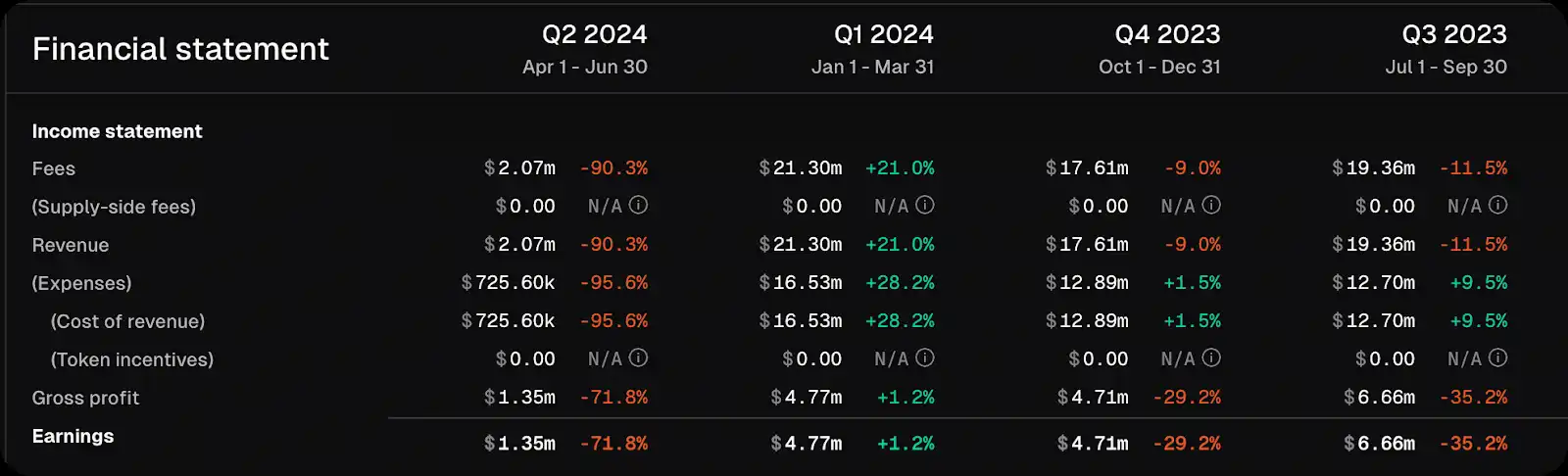 作为 memecoin 中心的受欢迎程度、空投带来的资本增长、解决垃圾邮件问题的技术升级以及对 AI 等领先趋势的支持,都为其在本周期的突出知名度和强劲收入做出了贡献。然而,这种增长并没有转化为收益。考虑到向质押者发行代币和运营成本,Solana 在过去四个完整季度中净亏损高达 25.3 亿美元,完全抹去了其收入并陷入赤字。