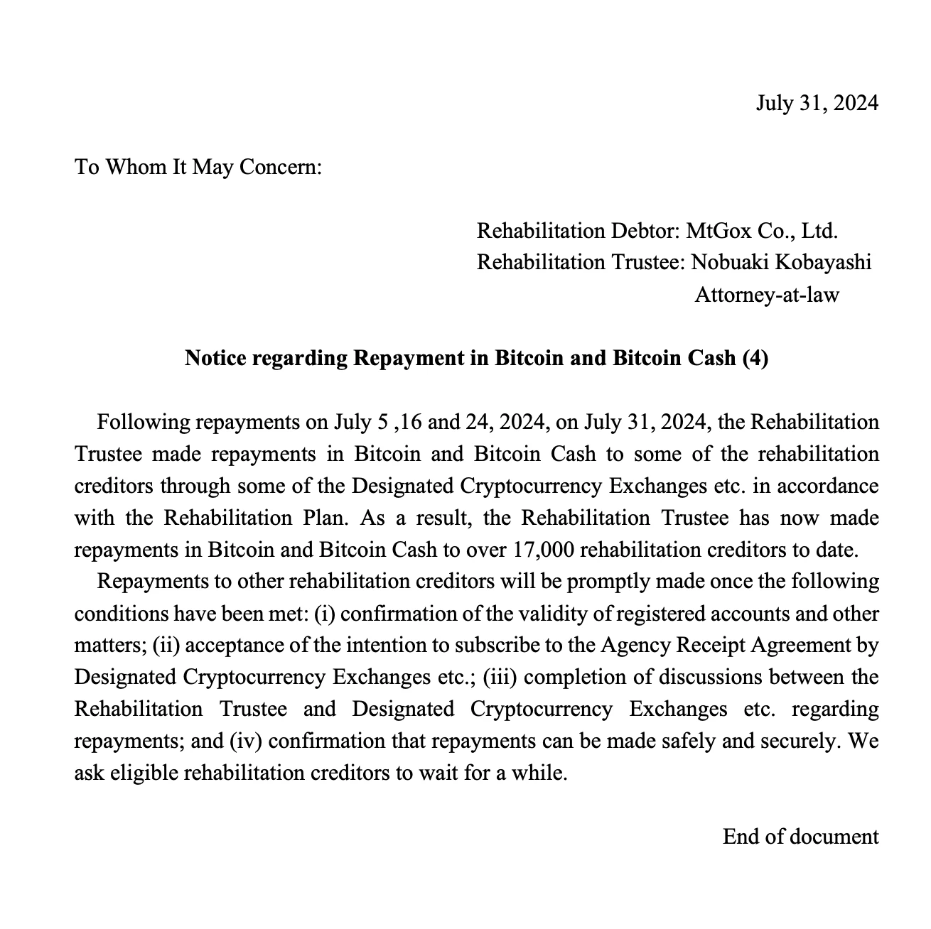 2024 年 7 月 31 日,Mt.Gox 交易所发布公告称,受托人在 7 月 5 日、 16 日、 24 日和 31 日根据赔付计划通过部分指定加密货币交易所以比特币和比特币现金形式向部分债权人进行了偿还,迄今已经向超过 17, 000 名债权人进行偿还。