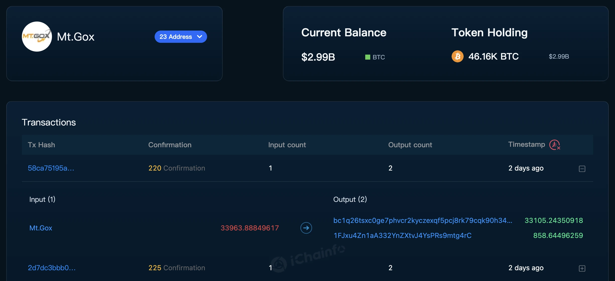 为了监测 Mt.Gox 交易所剩余地址的资金变化情况,iChainfo Search 推出了 Mt.Gox 专题页面(https://search.ichainfo.com/entity/mtgox),展示 Mt.Gox 相关地址的资金余额和最新交易情况。