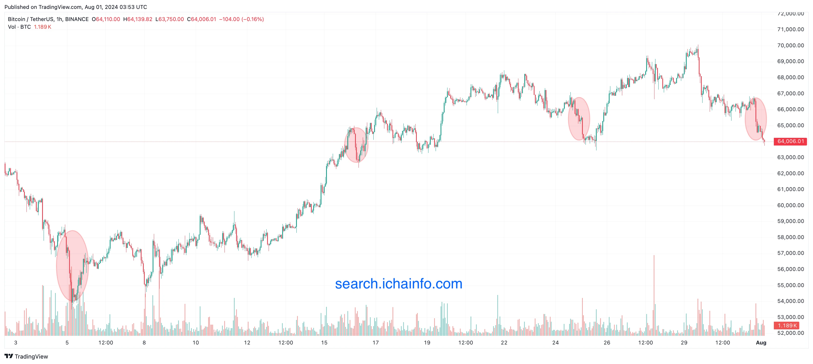 在 Mt.Gox 交易所 7 月进行的赔付中,虚拟货币市场均收到较大影响,根据 search.ichainfo.com 在赔付当日及次日,比特币的价格均有不同程度的下跌,跌幅在 4% -8% 之间。