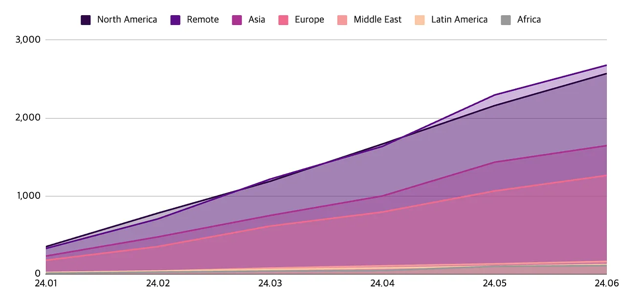 2024 年上半年按大洲累计的 Web3 招聘职位,来源:Web3 Jobs,Tiger Research