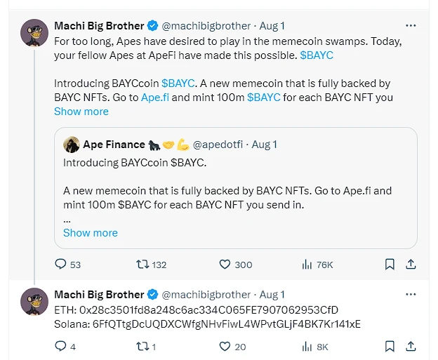 KOL @0x SunNFT 在推特上透露自己在 MEME 代币 BAYC 上 1 分钟赚 15 万 U 的暴富小故事令无数人唏嘘不已。在人们仔细研究后发现,这可能是加密资深玩家黄立成(麻吉大哥)的又一个项目。
