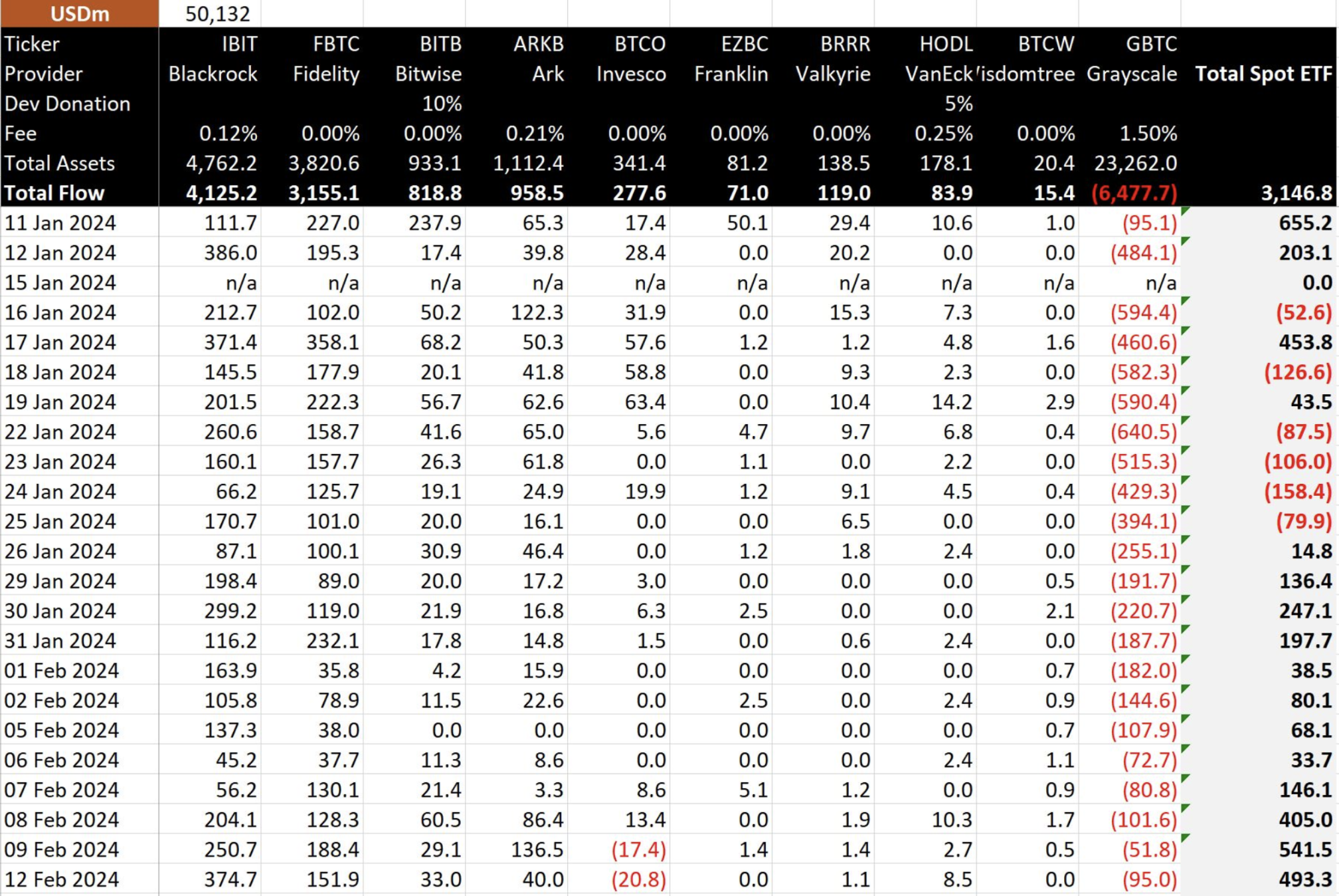 事实上,自那一天起(发行后的第 12 个工作日),比特币 ETF 便开始了持续的资金净流入。