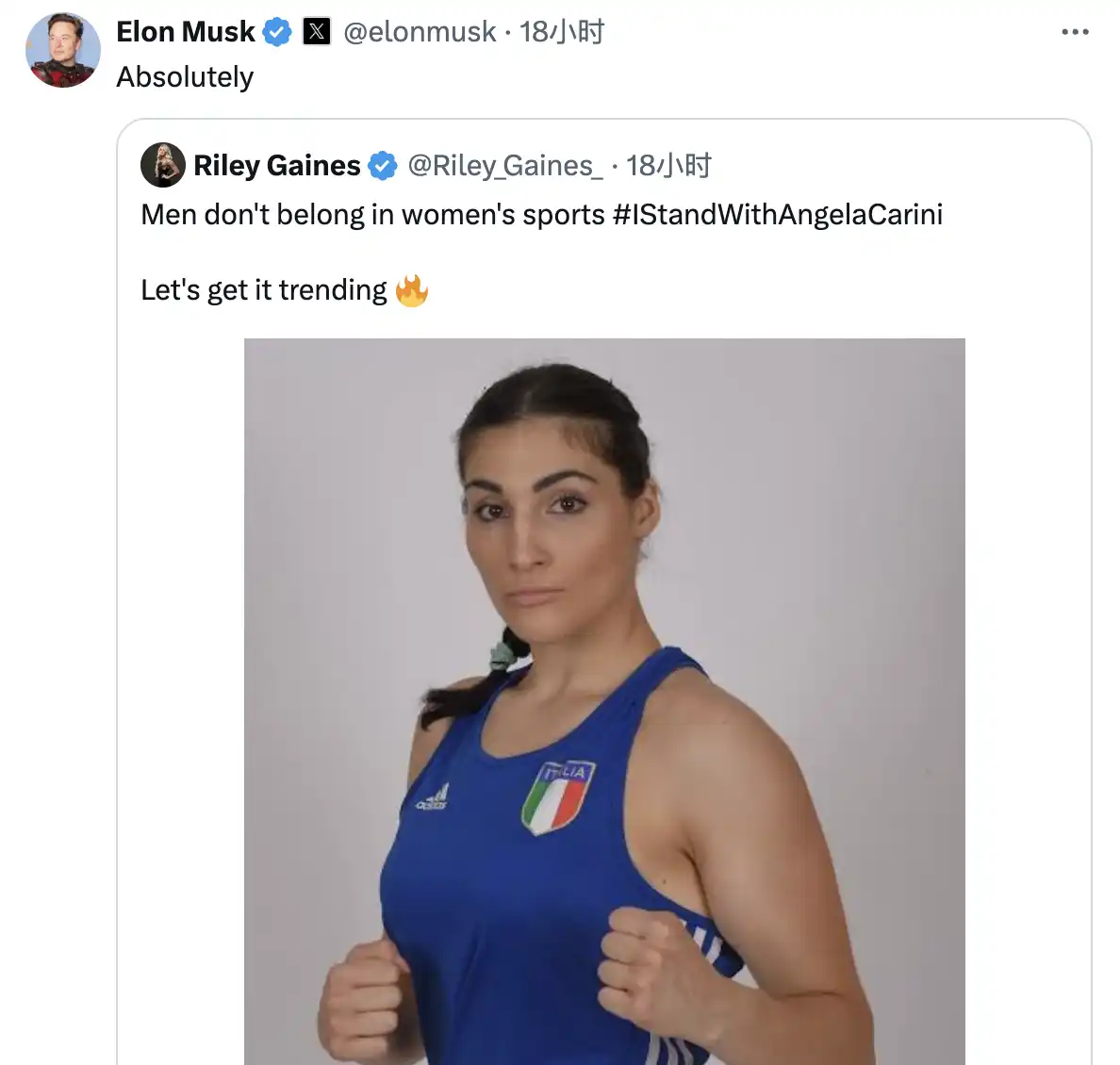 该事件在全网讨论都非常多,涉及体育公平性和跨性别权利的争议,许多知名人物都针对此事件进行发生。比如特朗普表示当选后将禁止男运动员参加女子比赛;马斯克在 18 小时前也社交媒体转发了「Men don't belong in women's sports #IStandWithAngelaCarini」的推特。