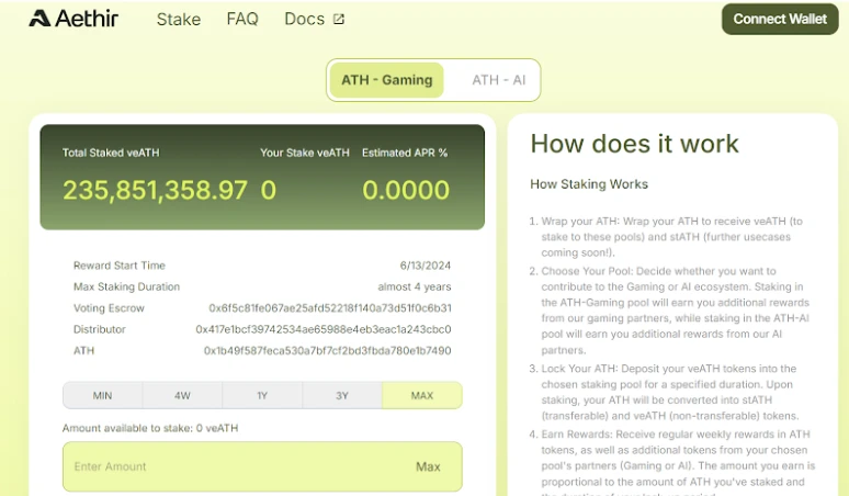 使用 Aethir 质押平台非常简单。按照以下步骤质押用户的 ATH 并开始赚取奖励: