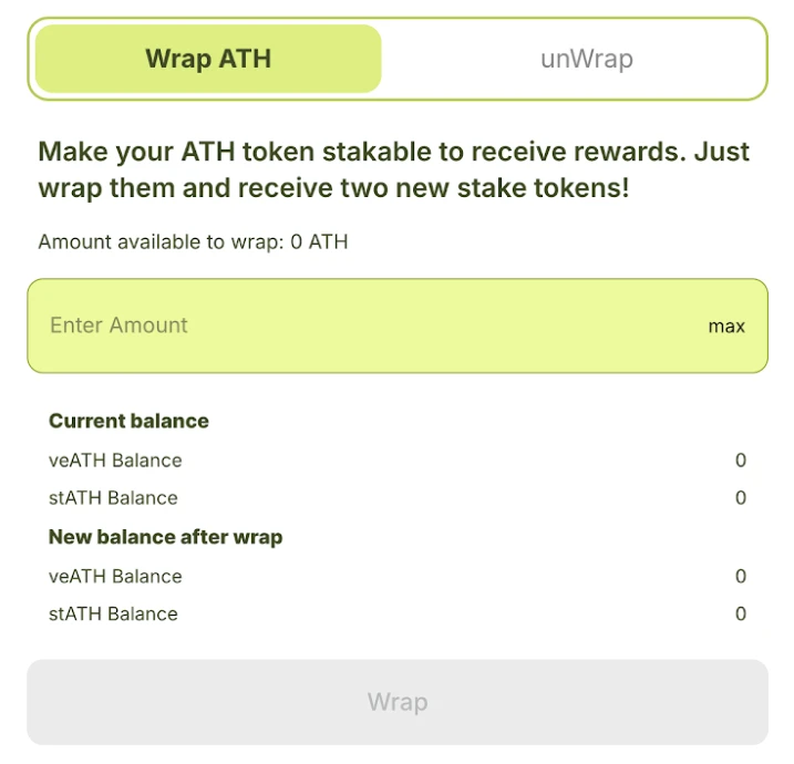 用户连接钱包到 Aethir 的质押平台并导航到 Wrap - unWrap 选项,进行 wrap ATH,并接收 veATH,然后用户可以将其质押到两个可用质押池之一。