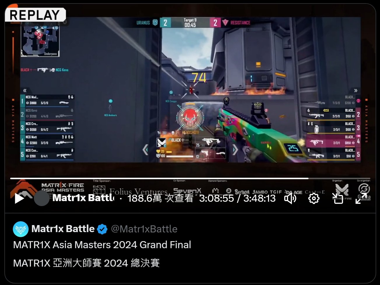 最后,我们来看一下社群活跃度。根据公𫔭资料,MATR1X 亚洲大师赛决赛单场观看人次超过 188 万,总曝光超过 1000 万人次、TikTok 上也以超百万播放。