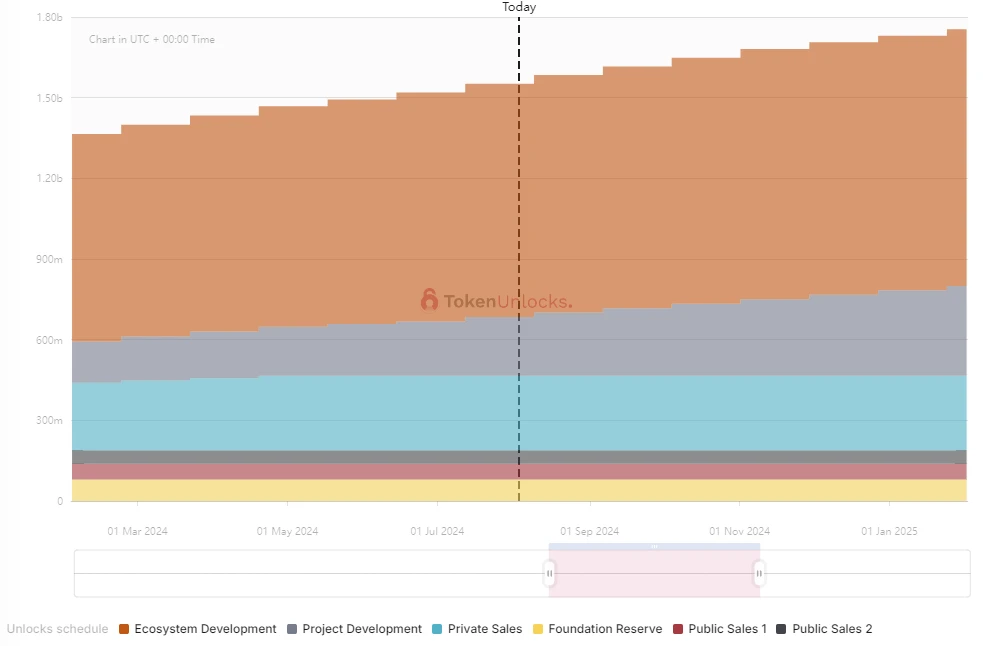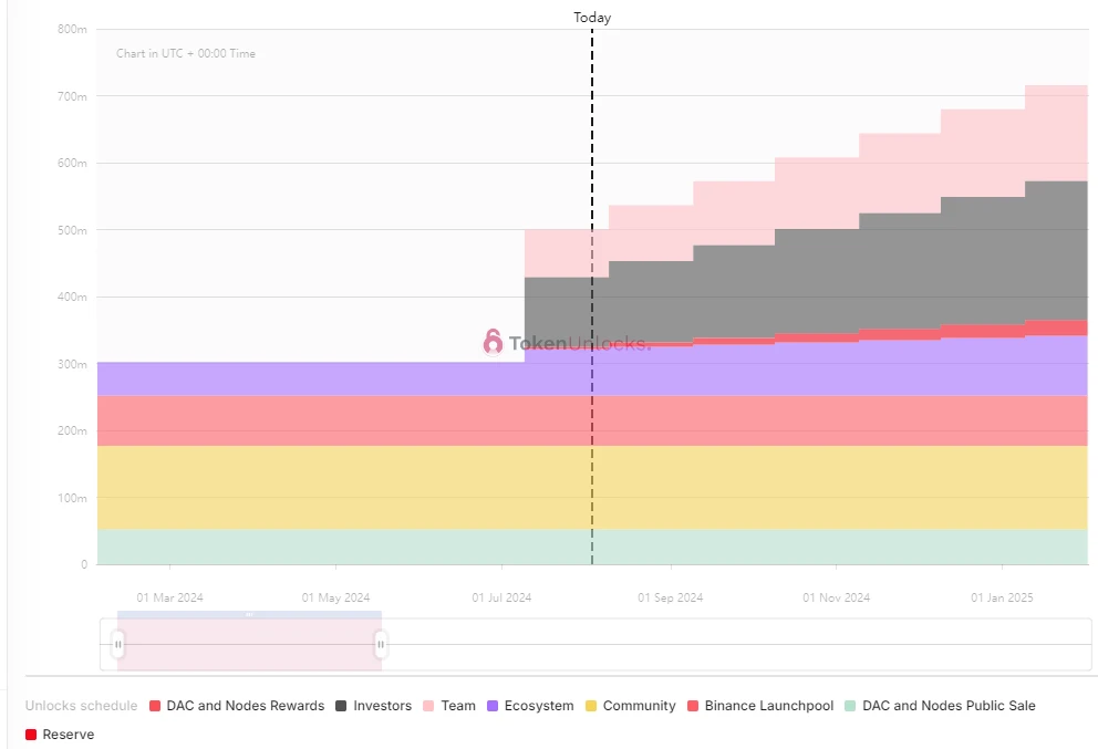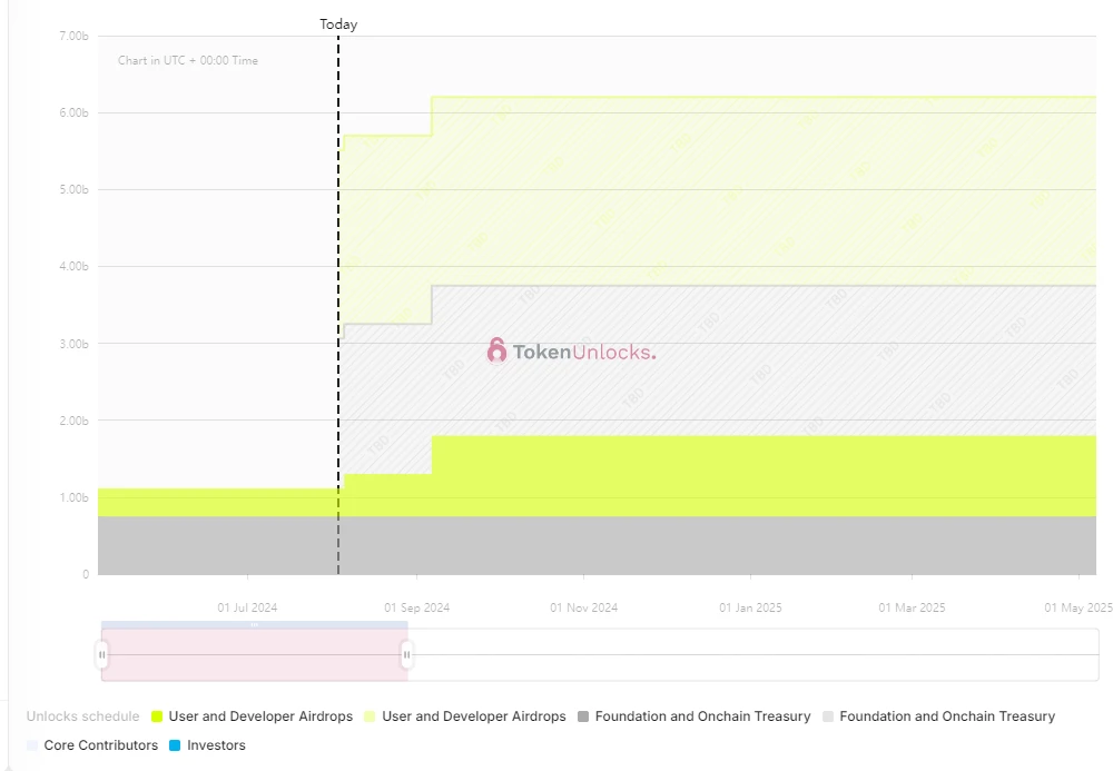本次解锁为代币上线以来的首次解锁,面向“开发者和用户”进行空投,共 1.85 亿枚代币,价值约 371 万美元。由于流通量仅为总量的 11% ,故本次解锁影响较大。