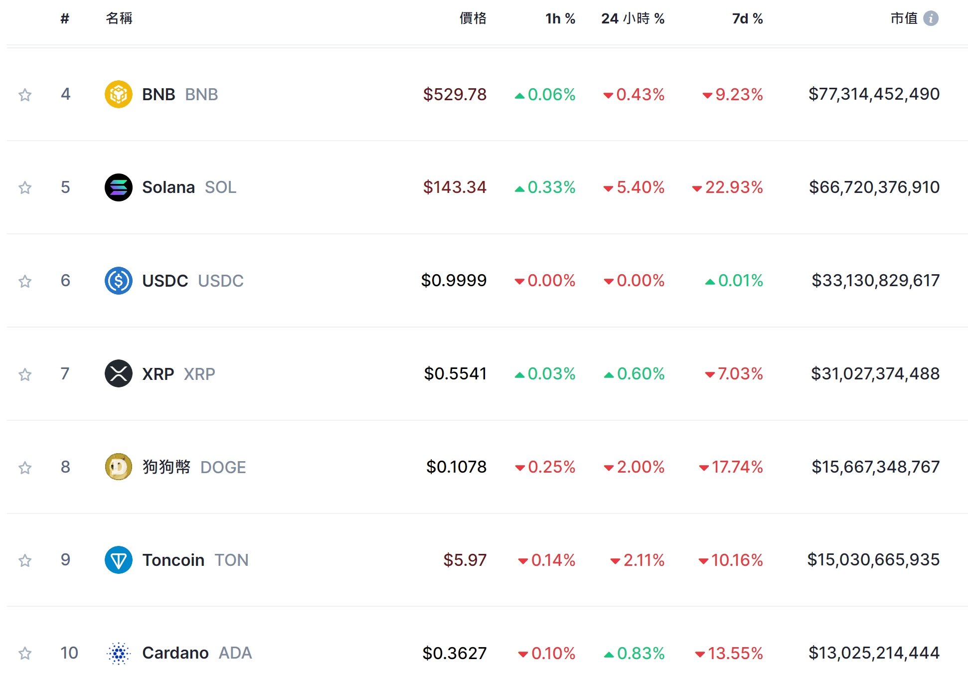 CoinMarkeCap 数据 显示 ,其他前十大代币近 24 小时涨跌不一,涨幅最大的是 ADA ,达 0.83%,跌幅最大的是 SOL,下跌 5.4% 现报 143.34 美元。