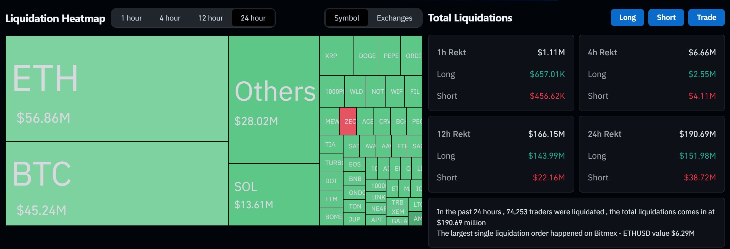 根据 Coinglass 数据 显示,过去 24 小时,加密货币全网爆仓金额达 1.9 亿美元,其中多单爆仓 1.52 亿美元,空单爆仓仅有 3872 万美元,共有 74253 人遭到清算。