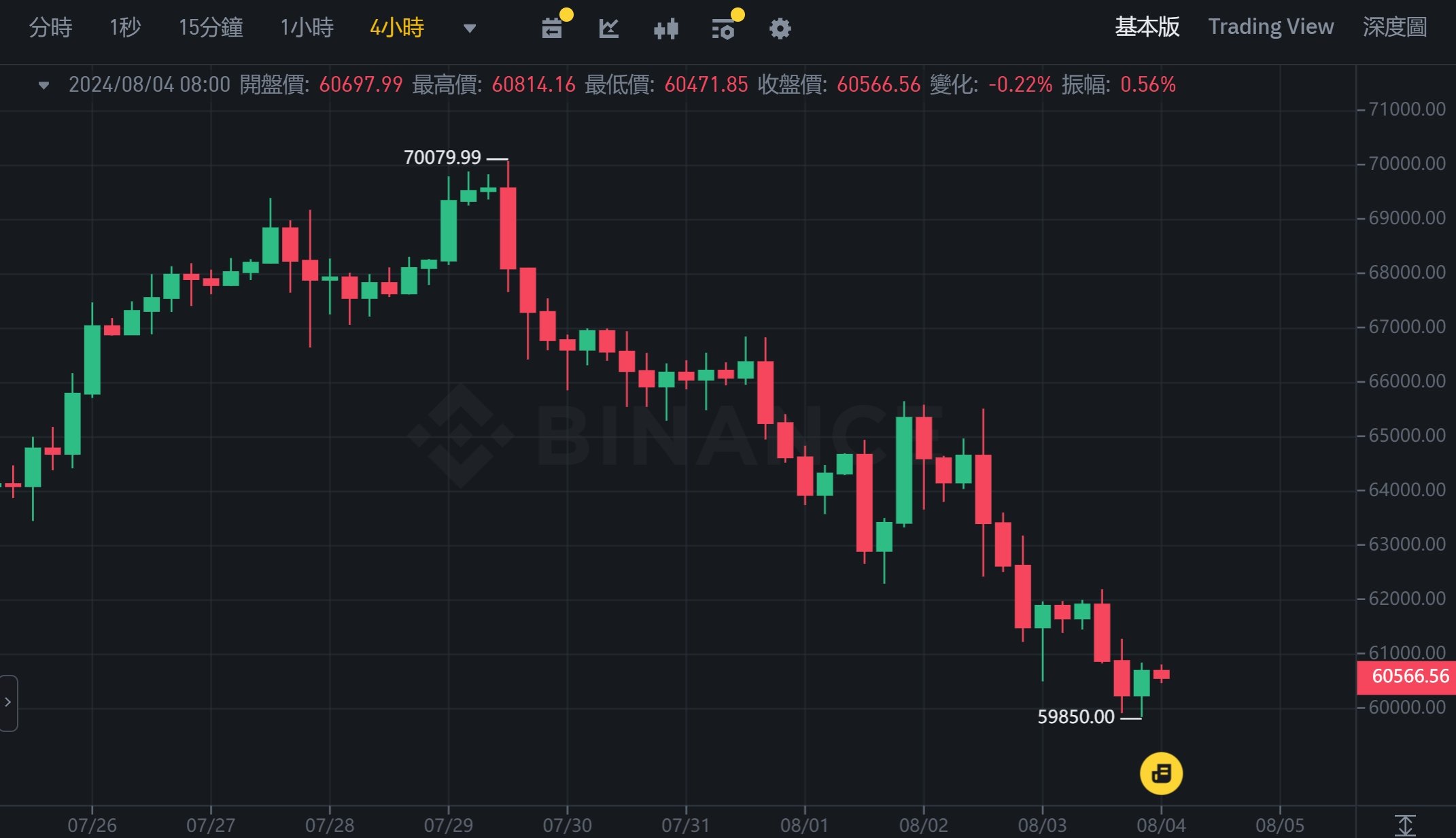 比 特币自 7 月 29 日触及近期高点 70,079 美元后一路下跌,在今晨 5 时更一度 跌破 6 万美元,最深下探 59,850 美元,创下 7 月 14 日以来最低。