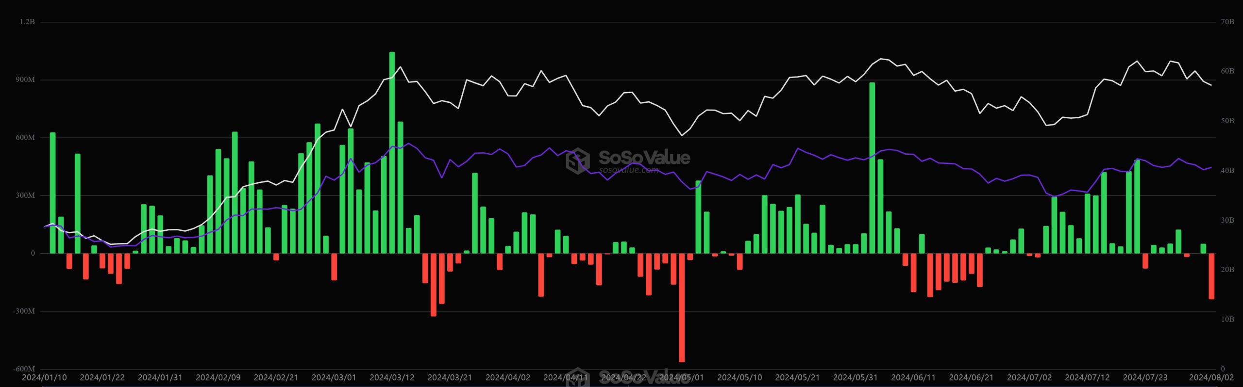 不过值得注意的是,比特币近期跟美股一样走势低迷,资金面似乎也不太乐观,SoSoValue 数据 显示,美国的比特币现货 ETF 在周五出现自 5 月 1 日以来的最大单日流出量,达到 2.3745 亿美元,这也是自比特币现货 ETF 1 月推出以来,历来第 4 高的单日流出量。