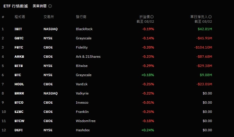 从 12 档比特币现货 ETF 的资金进出来看,灰度最近推出的比特币迷你信讬 BTC 是仅有两档实现资金净流入的 ETF 之一,净流入 988 万美元,贝莱德的 IBIT 资金净流入近 4,300 万美元。
