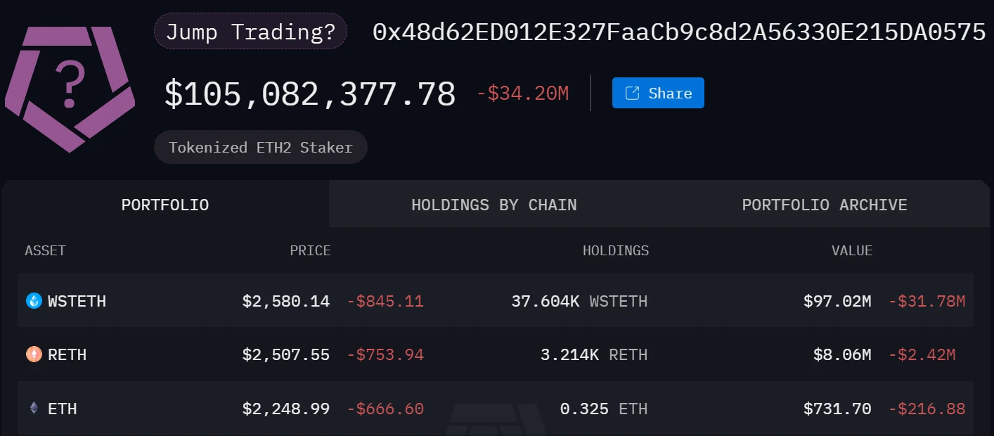截止发文时, Jump Trading 仍有约 3.7 万枚 wstETH ,价值 1 亿美元,此外还有 800 万美元的 RETH,而 赎回部分 均已转移或销售完毕。