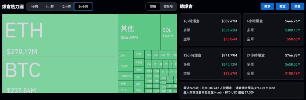 如此剧烈的波动,根据 Coinglass 数据 显示,过去 24 小时,加密货币全网爆仓金额超 7.6 亿美元,其中以太坊爆仓 2.7 亿美元居冠、比特币 2.3 亿美元次之。共有超 20 万人遭到清算。