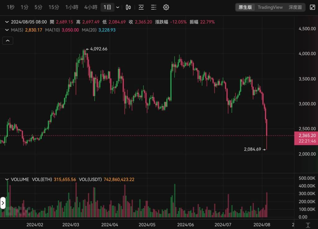 撰稿当下,ETH 又快速拉回至 2350 美元水平附近,一小时内的上下震盪将近 30% 非常剧烈。
