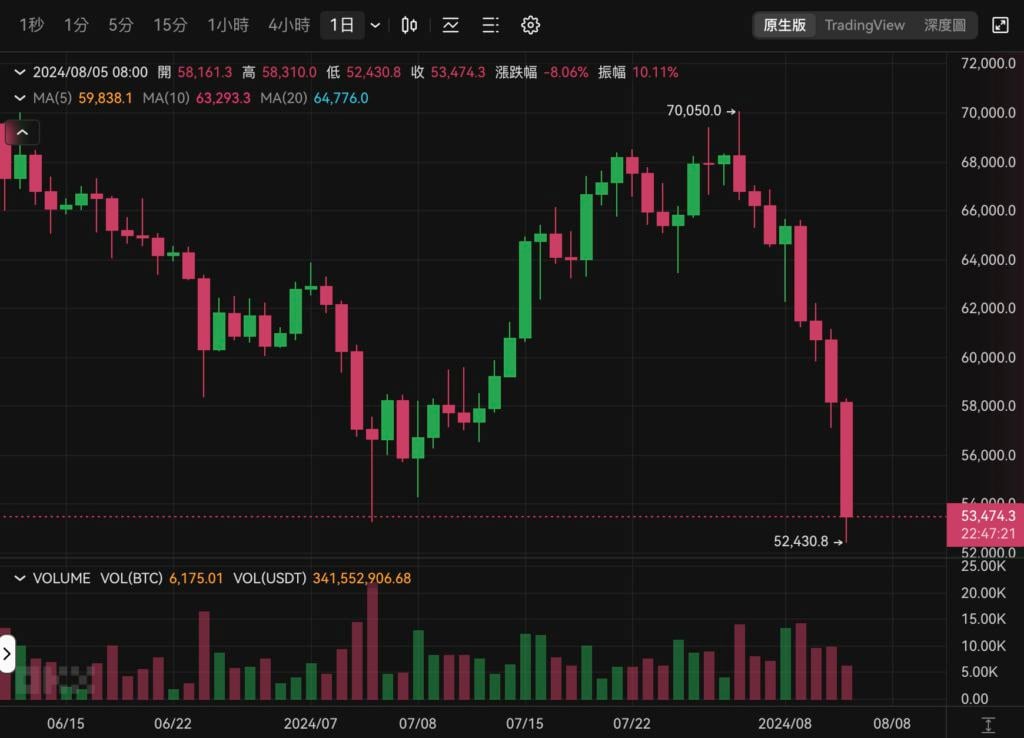 比 特币从昨晚 10 点左右,从六万美元水平𫔭始不断下杀,撰稿当下最低来到 52,430 美元,创下近半年来最大跌幅。撰稿当下报 53,474 美元,近 24 小时跌幅达 11.9%。( 14:30 更新,比特币一度跌破五万大关 )