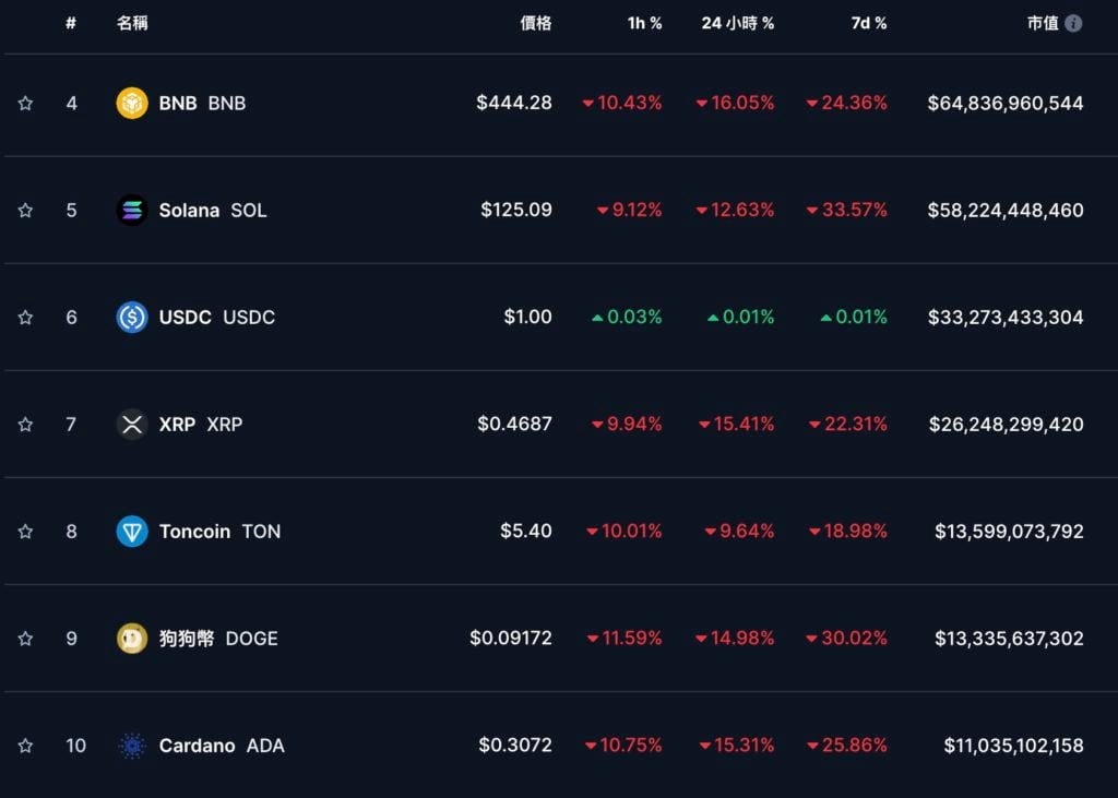 CoinMarkeCap 数据 显示 ,其他前十大代币近 24 小时普跌,跌幅最大的是 BNB,达 16.05%,其他如 SOL、XRP、 DOGE…跌幅也都有 10~15 %。