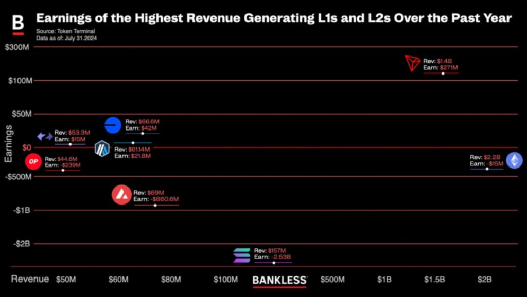 下 图是支撑最具收入和收益的 L1 和 L2 网路的资料。今天,我们将探讨按收入排名前四的 L1 和 L2,并分析这些区块链实际保留的收入是多少。