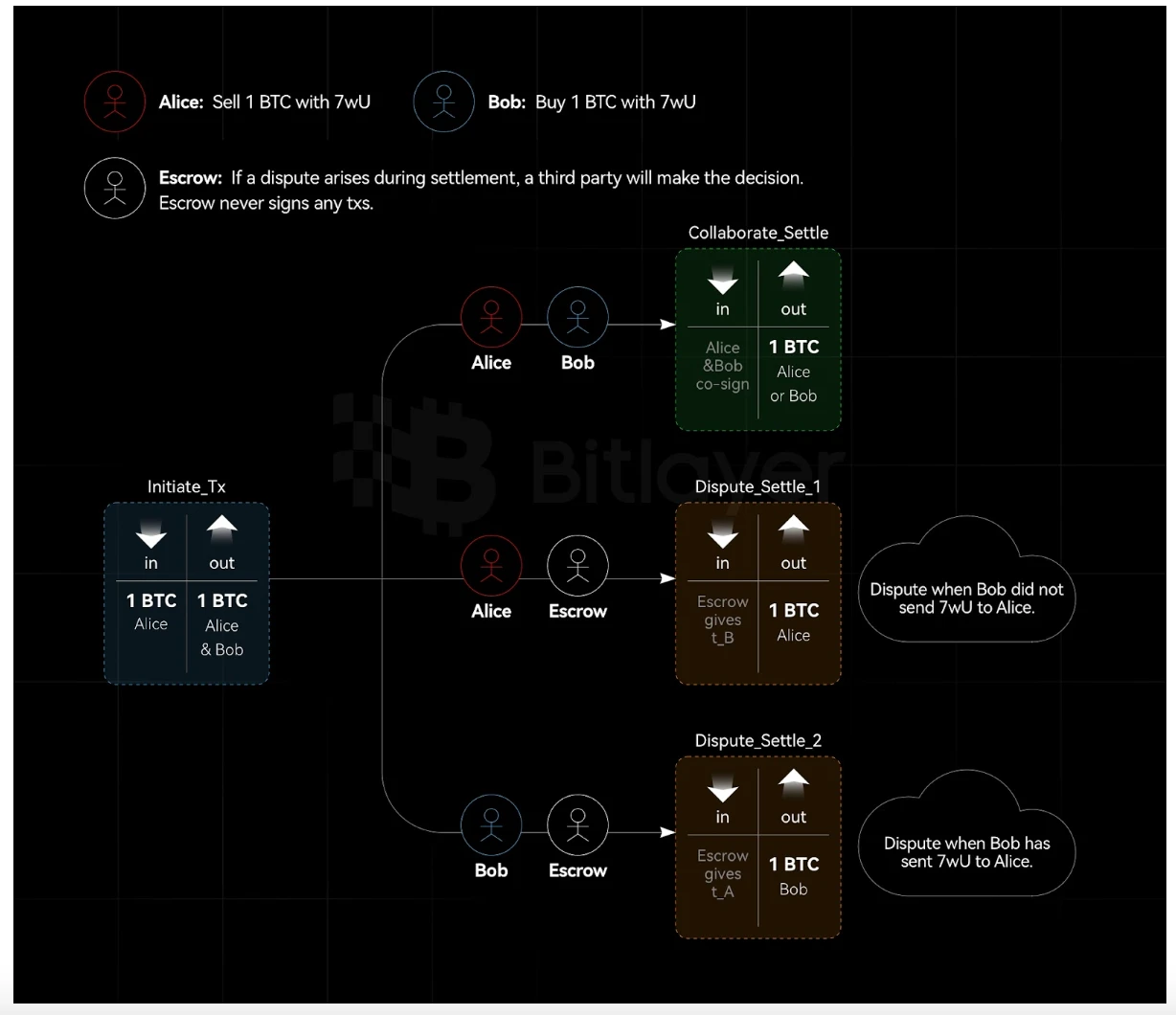 Alice 选择一个随机值$t_A$,将某交易的 adapator 为$t_A ᐧ G$的 Schnorr 预签名$(\hat{R}_A,\hat{s}_A)$发送给 Bob,该交易为将 funding output 发送给 Bob。Alice 同时给 Bob 发送一个密文,该密文包含对秘密$t_A$并将托管公钥$E$调整为$E_c = E + hash(E, c)G$的\textbf{可验证加密}$C = Enc(E_c, t_A)$。该过程中,Bob 收到 Alice 的预签名后,加上自己的签名,不满足 2-of-2 MuSig,从而无法花费 funding output。仅当 Bob 知道$t_A$(由托管方可提供),或 Alice 另外签署完整签名发送给 Bob,才能花费 funding output。