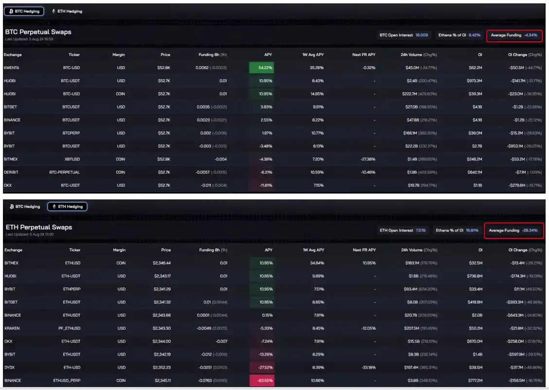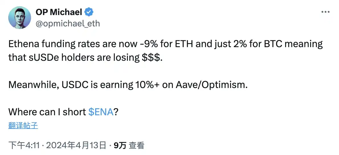 海外 KOL @OP Michael 记录了 4 月 13 日市场情绪极度悲观时 Ethena 的整体仓位费率状况,彼时 ETH 综合费率一度为 -9% ,BTC 综合费率则仅为 2% ,协议及 sUSDe 持有者均已开始面临亏损。