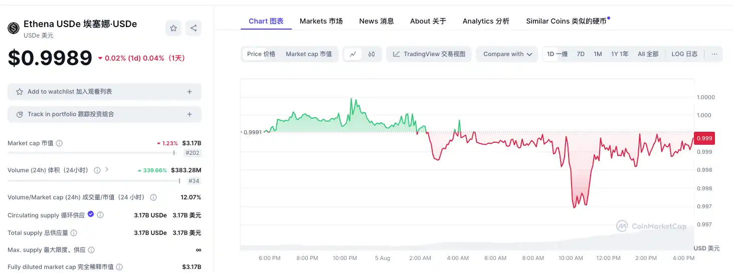 这也在一定程度上导致 USDe 脱锚,据 CoinMarket 数据 ,其币价短时触及 0.997 美元,截止撰稿时仍处于脱锚状态。