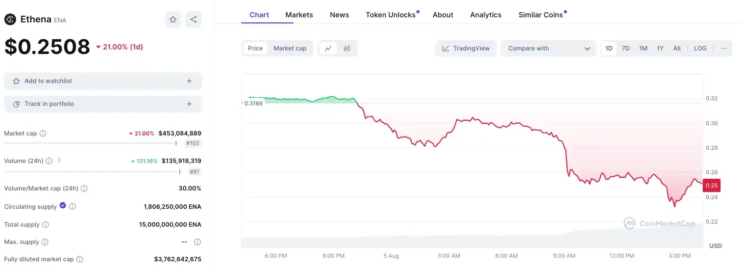 虽然一年中持续负费率的情况通常极为少见,但以太坊的下跌导致质押的以太坊被清算。据 PeckShield 监测,今日已有数名 ETH 鲸鱼遭到了清算,且价值均超数百万美元。形势直转之下,ENA 也迎来了一定的抛压。据 CoinMarket 数据 ,ENA 短时触及 0.232 美元, 24 小时跌幅达 21% 。
