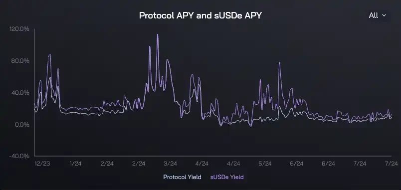 然而随着市场持续阴跌,协议收益率曾在 4 月中旬短暂跌至-2.09% ,随后立刻反弹,分别触及 22.77&和 77.58% 高点。但自 6 月至今,Ethena 协议收益率和 sUSDe 收益均降至 20% 以下。(由于 Ethena 官方数据更新有延迟,只收录至 7 月 31 日数据)