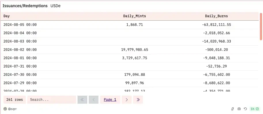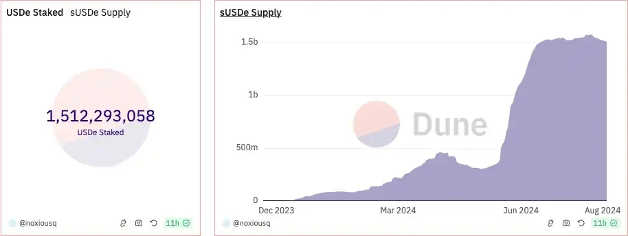 Dune 数据 显示,USDe 在过去一个月内多次出现了上千万美元量级的销毁,这意味着抵押物被大批量赎回。从 sUSDe(USDe 质押凭证代币)的 供应量 也可看出,在过去一周内,有近 6 千万美元的 sUSDe 解除了质押