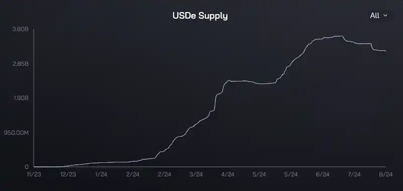 也就是说,USDe 模型基本只有当市场处于看涨情绪下才能良好运行。2024 年初的牛市驱动着空头高费率,从而支持了 USDe 在 2024 年初的采用,但据 官方数据 显示,USDe 供应量在 4 月有小幅缩减,随后迅速增加,直至 7 月初,加密货币市场陷入下行趋势,USDe 的供应量也持续下降。