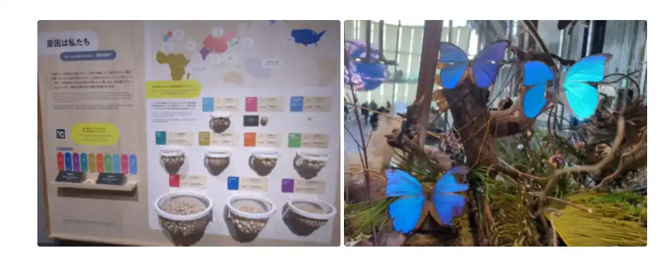 左图:显示不同国家对世界二氧化碳排放量贡献的图表。右图:自然蝴蝶复制品和机器人蝴蝶复制品。