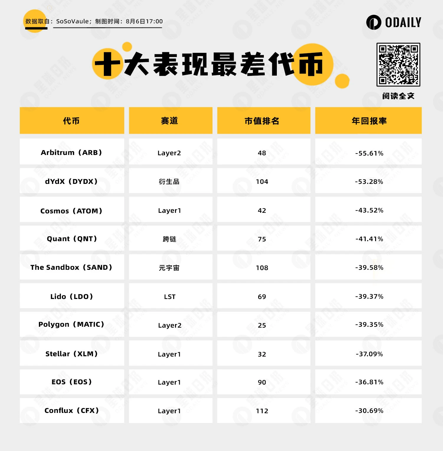 反观最差榜单,曾经备受关注的 Layer 2、LST 等等则成为了代表性板块,ARB 更是比较尴尬地摘得了表现最差代币的称号,LDO、MATIC 和 SAND 等曾在上一个周期内搅动风云的代币在本周期内表现并不理想,XLM、EOS 等则仍走在退幕的道路上。