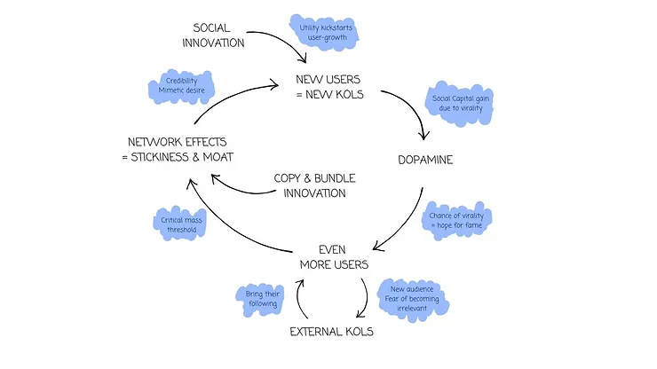 传统社交媒体平台通过一种正向循环来成功:新功能或用例吸引大量用户,这些新用户又吸引了现有的关键意见领袖,因为他们希望接触到新观众,同时担心被遗忘。KOL 的参与提升了平台的可信度,进一步吸引更多用户加入。这种循环不断增强网络效应,使平台更具吸引力,并增加用户的粘性。
