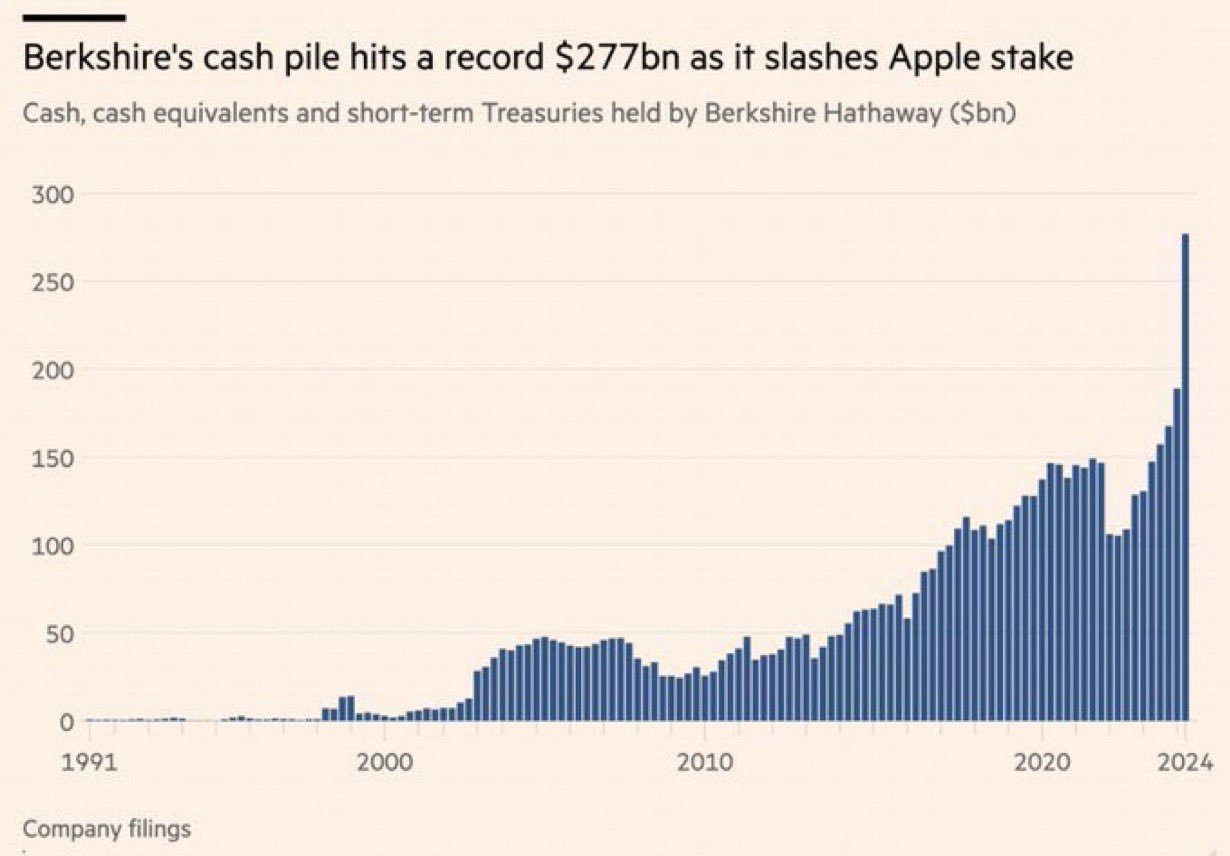 首先,伯克希尔哈撒韦在今年伊始就保持着套现股票提高现金储备的动作已经表明了可能是这个星球上最懂投资的人已经提前开始避险了。巴菲特也在第一季度的股东大会上表示(当时伯克希尔哈撒韦的现金储备已接近2000亿美元),除非见到风险很小且高回报的机会,否则他们不会使用这些钱。而就在北京时间上周六,伯克希尔哈撒韦财报显示其在二季度出售了持有的苹果股票的接近一半,现金储备来到了创纪录的2770亿美元。