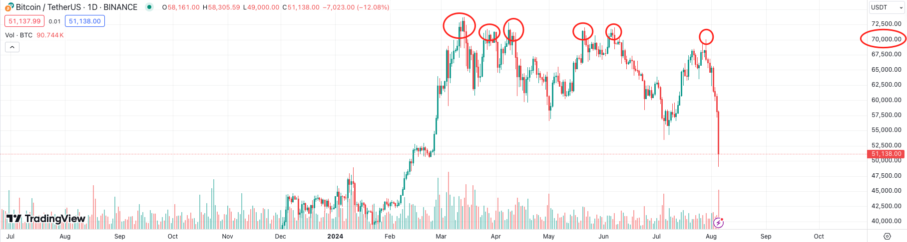 如果你认为这一切偏向宏观层面的信息可能并不能完全左右比特币的走势,那么我提供一个非常值得关注的,只从比特币的表现就能看到的一个非常明显的风险信号:比特币今年以来已经连续6次尝试突破并站稳7万,但都以失败告终,如果你连这么明显的信号都直接无视,那么我只能说你可能有一点上头了。