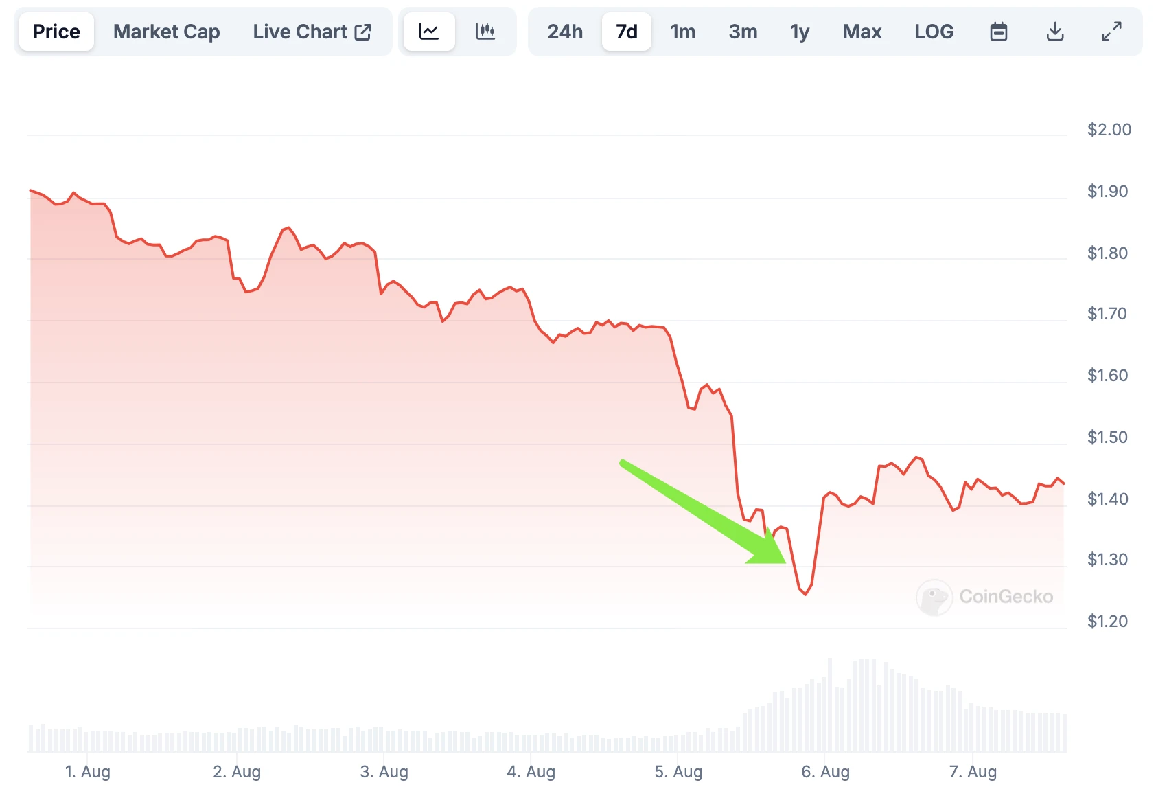 被盗事件在社区中迅速传播后,RON 的价格在原本下跌的趋势中进一步下滑,最低跌至 1.25 美元,短时间内跌幅超 8%。