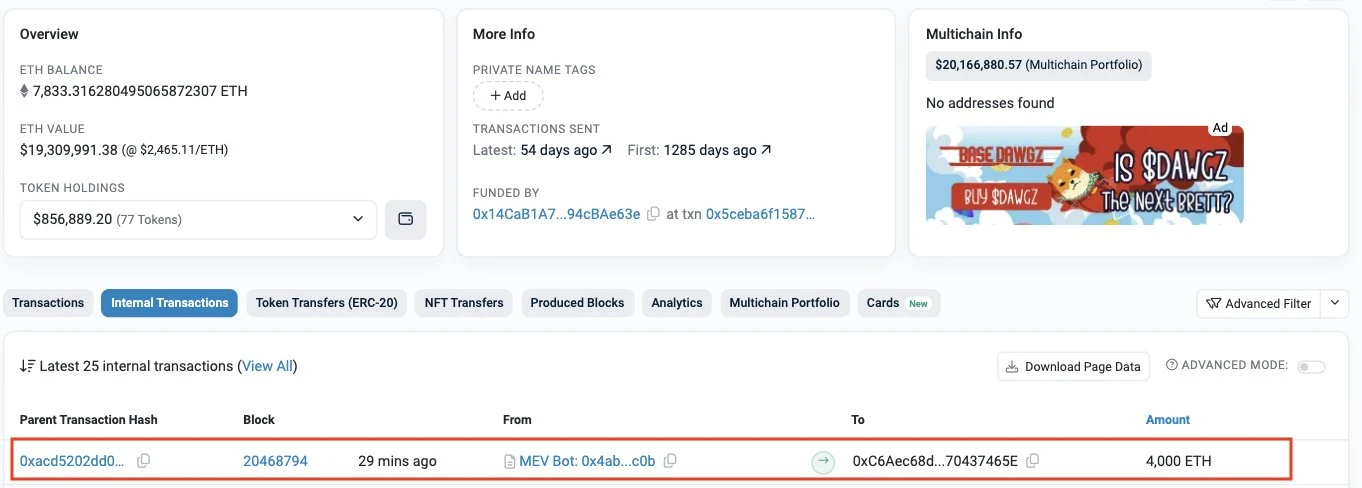 在被盗事件发生后, 据 Beosin 安全团队分析,此次异常行为的根本原因在于项目方升级合约时,未正常初始化配置跨链交易确认所需的 operator 权重,导致合约中的 minimumVoteWeight 参数为零,从而使得任何人的签名都能通过跨链验证。目前,Ronin bridge 已经流失 3996 枚 ETH,资金存放在 0xc6aec68dd6272efcbc74fb5308fe7f070437465e(该地址是 MEV bot,故推测可能是白帽行为)。