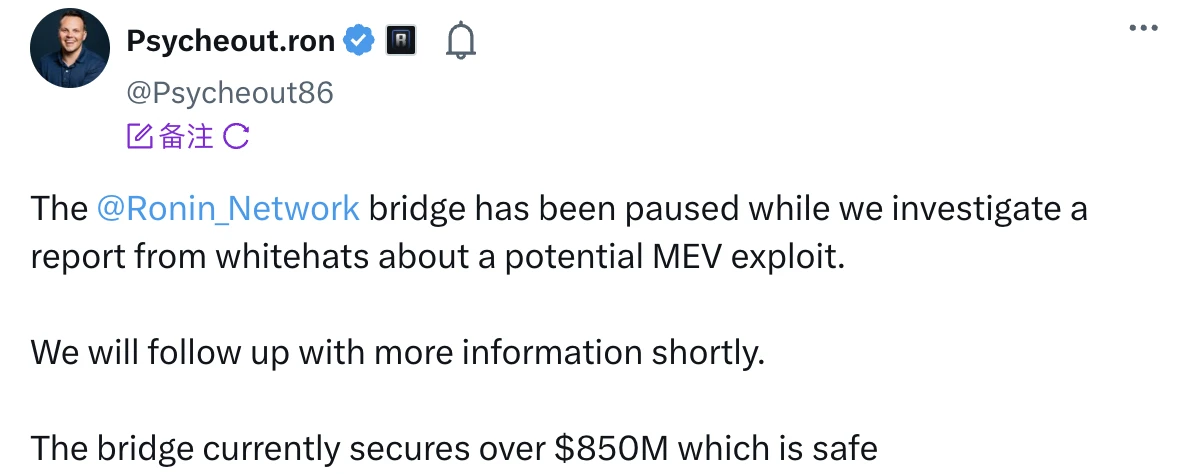 针对社区关心的 Ronin Bridge 被攻击一事,Ronin COO Psycheout 第一时间在 X 平台发文表示,当我们调查白帽黑客关于潜在 MEV 漏洞的报告时,Ronin Network 桥已暂停。团队将很快发布更多信息,并且强调 Ronin 桥目前安全保障了超过 8.5 亿美元的资金。