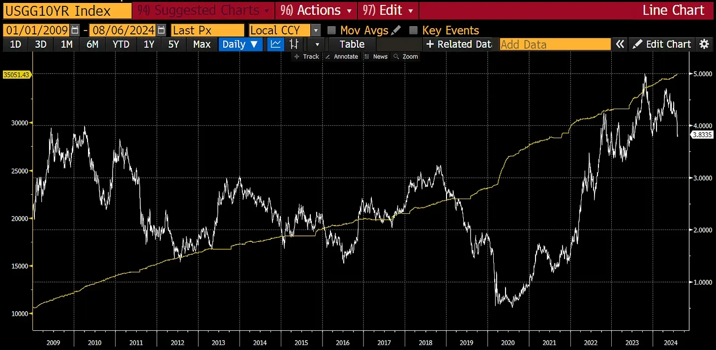 美国未偿债务总额(黄色)一直在上升。然而, 10 年期国债(白色)的收益率一直保持在相当狭窄的范围内,与不断增长的债务没有相关性。