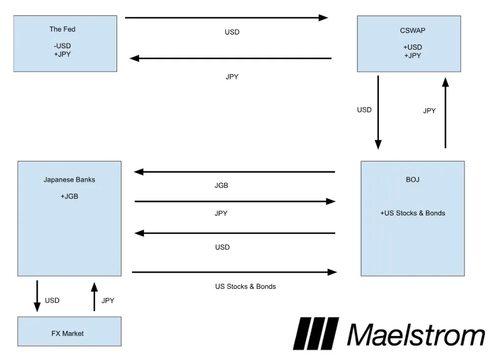 日本公司必须解除其头寸,但无法在公开市场上出售某些资产。这意味着美国的某个政府机构必须印钞并将其借给日本公司的某个成员。让我重新介绍一下自己,我叫中央银行货币互换(CSWAP)。