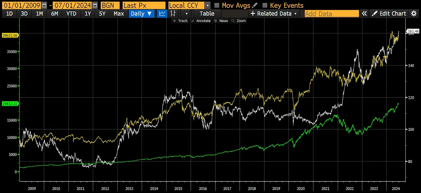 美元兑日元(白色)上升,这意味着日元相对于美元贬值了。它还带动了纳斯达克 100 指数(绿色)和日经 225 指数(黄色)一起上涨