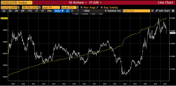 美国未偿债务总额(黄色)上升并向右移动。然而,10 年期国债(白色)的收益率一直在一定范围内波动,与不断增长的债务几乎没有关联。