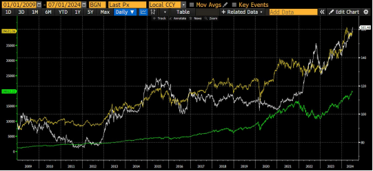 美元兑日元 (白色) 上涨,这意味着日元兑美元走弱,纳斯达克100指数 (绿色) 和日经 225 指数 (黄色) 也随之上涨。