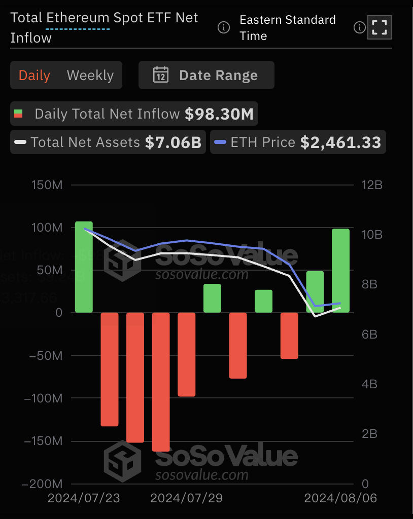 博链财经BroadChain获悉,根据 SoSoValue 数据,美东时间8月6日, 以太坊 现货 ETF 总净流入 9830.06 万美元。