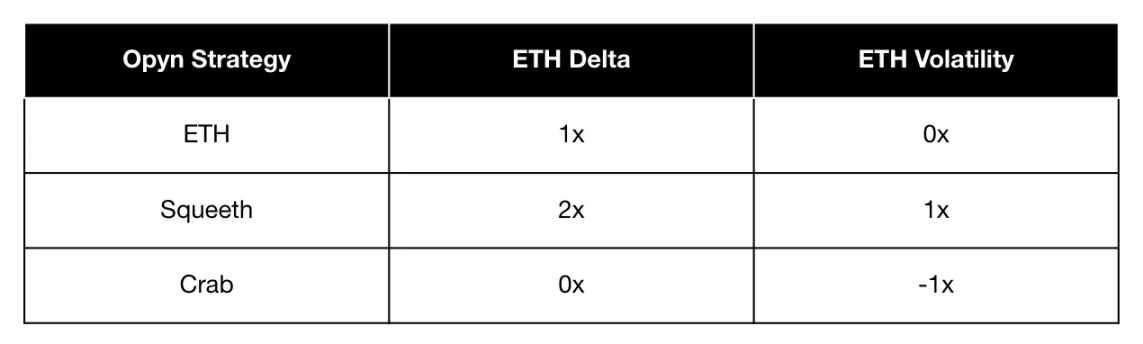 这些创新的金融工具允许交易者对资产的波动性进行投机。在高度波动的加密市场中,该产品提供独特的对冲风险或利用市场波动的方式。Opyn 利用现有市场开发新型永续合约,这些合约可以复制复杂策略、对冲独特风险并提高资本效率。Opyn 的永续产品包括稳定永续合约(0-perps)、Uniswap LP 永续合约(0.5-perps)、普通永续合约(1-perps)和平方永续合约(2-perps,也称为 Squeeth)。这些永续合约各有不同的目的:稳定永续合约为交易策略提供稳固的基础,Uniswap LP 永续合约在不直接提供流动性的情况下镜像收益,普通永续合约提供简单的多头 / 空头头寸,而平方永续合约通过二次敞口放大收益。这些永续合约可以组合成更复杂的策略。例如,蟹策略涉及在稳定市场中做空 2-perps,同时做多 1-perps,以获取资金。另一个例子是 Zen Bull 策略,它结合了做空 2-perps、做多 1-perps 和做空 0-perps,以在平静市场中赚取资金,同时保持多头敞口。