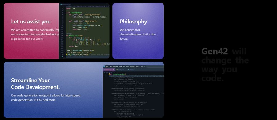 Gen 42 利用 Bittensor 网络提供去中心化的代码生成服务。他们的重点是创建强大、可扩展的工具,用于基于代码的问答和代码补全,这些工具由开源大型语言模型驱动。