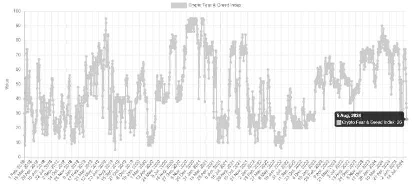 此次暴跌之后,加密市场的多头杠杆被大规模清理,大量短线现货持有者退出市场,市场基本面有所动摇但并未被摧毁。加密市场恐惧贪婪指数跌至 26 (恐惧状态),处于 2023 年以来的较低水平,短期内继续下跌的空间不大。