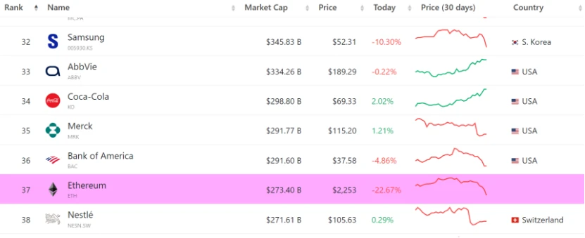 从 8 月 5 日的数据来看,ETH 市值为 2734 亿美元,在全球公司市值榜单中排名 37 位,低于可口可乐、美国银行的市值,甚至也低于巴菲特减仓苹果后伯克希尔的现金储备(2769 亿美元)。