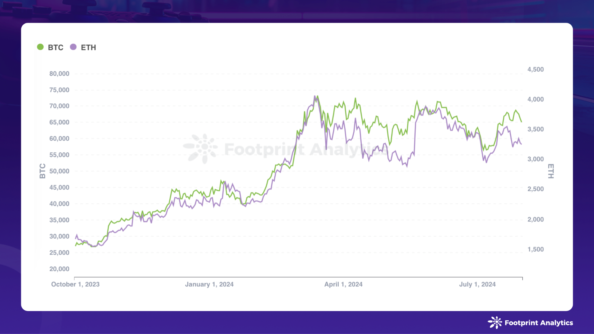 7 月份,加密货币市场经历了显著波动。比特币从月初的 63,381 美元起步,月末收于 64,989 美元,实现了 2.5% 的增长。7 月 5 日,比特币触及月内最低点 56,608 美元,而 7 月 27 日则达到最高点 68,806 美元。以太坊则从 3,438 美元开盘,月末跌至 3,243 美元,跌幅为 5.7%。7 月 7 日,以太坊创下月内最低价 2,939 美元,7 月 21 日达到最高价 3,542 美元。