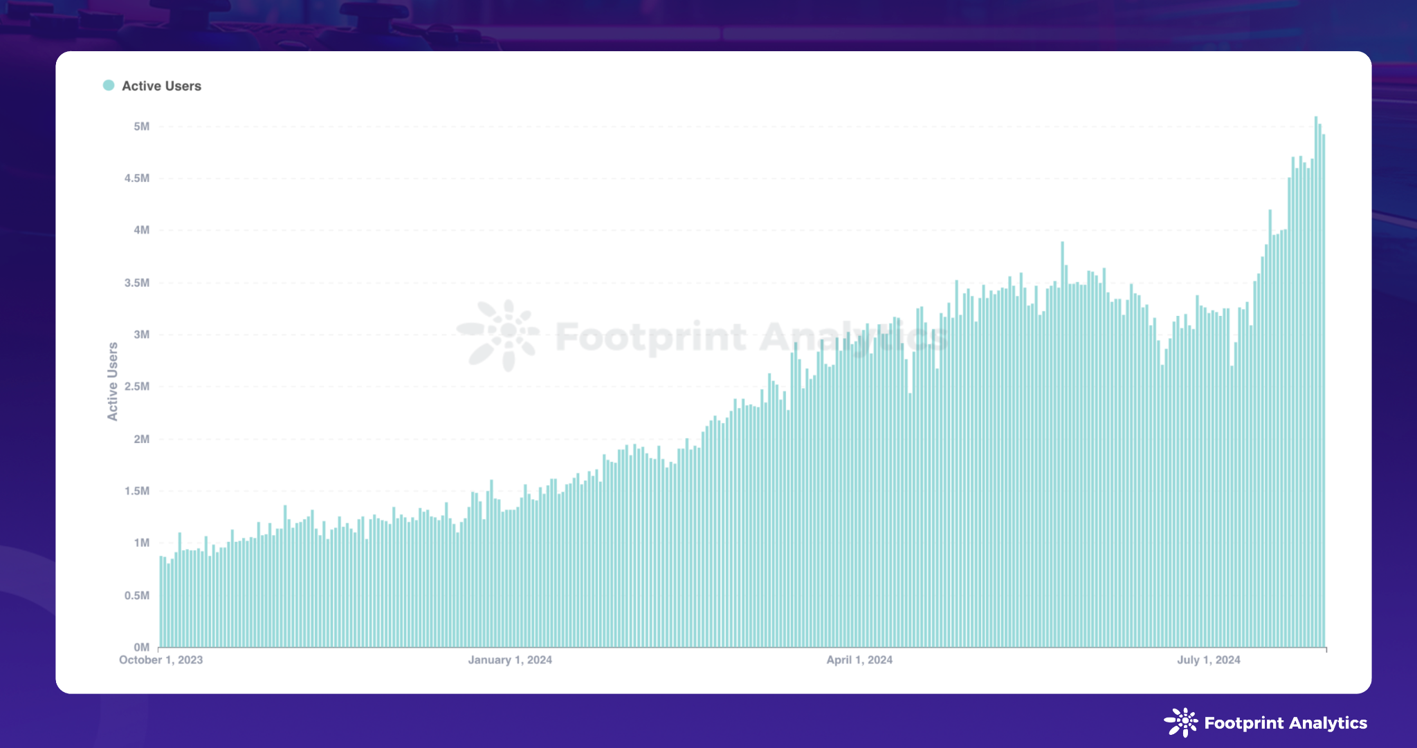 以独立钱包计数的日均活跃用户(DAU)增至 390 万,较 6 月份增长 19.4%。DAU 在 7 月 17 日突破 400 万大关,并在 7 月 29 日达到 500 万,不断刷新记录,显示出行业参与度的提升。